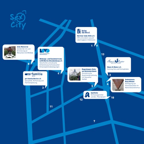Alle Stationen befinden sich rund um den Nollendorfplatz und sind fußläufig in maximal zehn Minuten zu erreichen.
